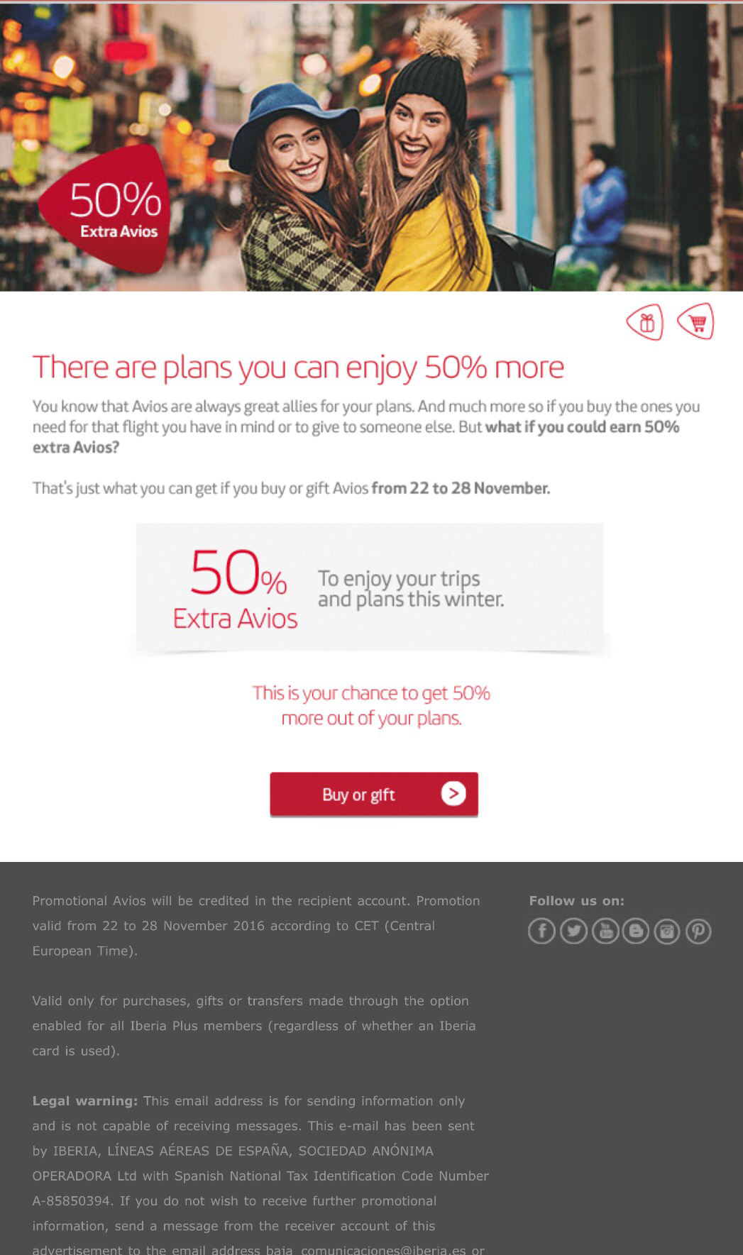 aviosBonusIberiaIberiaPlus 50% bonus on avios purchases 22-28th of November This is a quick post about new Iberia’s promotion: 50% bonus on avios purchases 22-28th of November. This offer is not targetted and open to all IberiaPlus members. Just go to ‘Buy Avios’ section and you should be able to see the bonus avios option. Share this: Click to share on X (Opens in new window) X Click to share on Facebook (Opens in new window) Facebook Click to email a link to a friend (Opens in new window) Email Click to share on LinkedIn (Opens in new window) LinkedIn Click to share on Reddit (Opens in new window) Reddit Click to share on WhatsApp (Opens in new window) WhatsApp Like Loading...